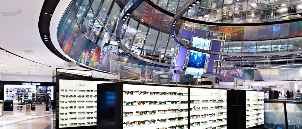 Дыхание Пигаля – прогулка по Сене – чистая элегантность, Париж в Берлине. Теперь, с учетом нового дизайна первого этажа и блистательным праздником в честь открытия 14 ноября в присутствии Lagerfeld Muse Baptiste Giabiconi и многих именитых гостей, Galeries Lafayette очаровывает столицу еще более утонченным французским стилем. В 2012 г. первый этаж галереи был полностью перестроен и теперь предлагает новые возможности эксклюзивного шопинга в отделе Beauty, аксессуаров и бижютерии. Первой ласточкой в начале года стало открытие собственного магазина Гуччи. Благодаря инвестициям в переоборудование первого этажа торгового дома уникальная архитектура здания, которая привлекает многих клиентов, стала еще более открытой. Шопинг превратился в настоящее приключение. Именно поэтому Galeries Lafayette работает с командой известных архитекторов Plajer & Franz. Фасады известных парижских зданий, названия французских улиц, новая концепция освещения нашли здесь свое воплощение, чтобы показать посетителям, что им достаточно прийти на Фридрихштрассе, чтобы насладиться уголком Парижа во всех его гранях, от элегантных фэшн- брендов до французского гастрономического разнообразия для гурманов – в Galeries Lafayette придают большое значение французскому умению наслаждаться жизнью. Plajer & Franz вдохновенно говорят о своей работе: „Прогулка по Парижу. Вдоль Сены, мимо типичных фасадов и в окружении силуэта города – при помощи картин мы разработали концепцию для перестройки первого этажа берлинской Galeries Lafayette , которая переносит в немецкую столицу уголок Парижа и одновременно усиливает связь с французским домом-родоначальником. Этому служат, например, эскизно намеченные элементы фасадов из стекла, зеркальных поверхностей и драпировок, мебель и стойки для товаров в французском стиле, а также картина исторического купола парижской Galeries Lafayette в виде фрезерованной поверхности позади касс».